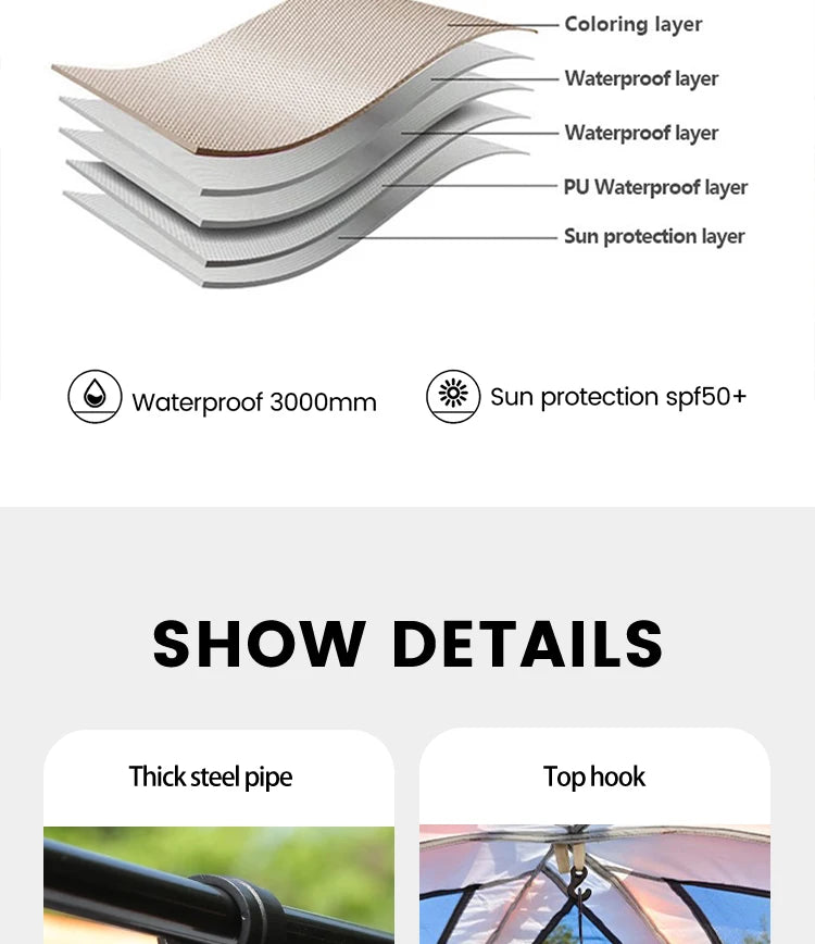 Stay dry, cool, and protected with its double-layer design, UV-blocking fabric, and wind-resistant frame that stands strong through unpredictable weather.